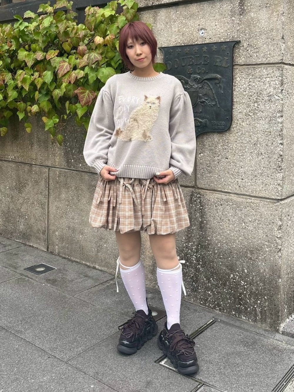 猫柄がキュートなニットトップスに チェックのバルーンスカートを合わせた ニットコーデ♡ Candy Stripper原宿店/中西/160cm