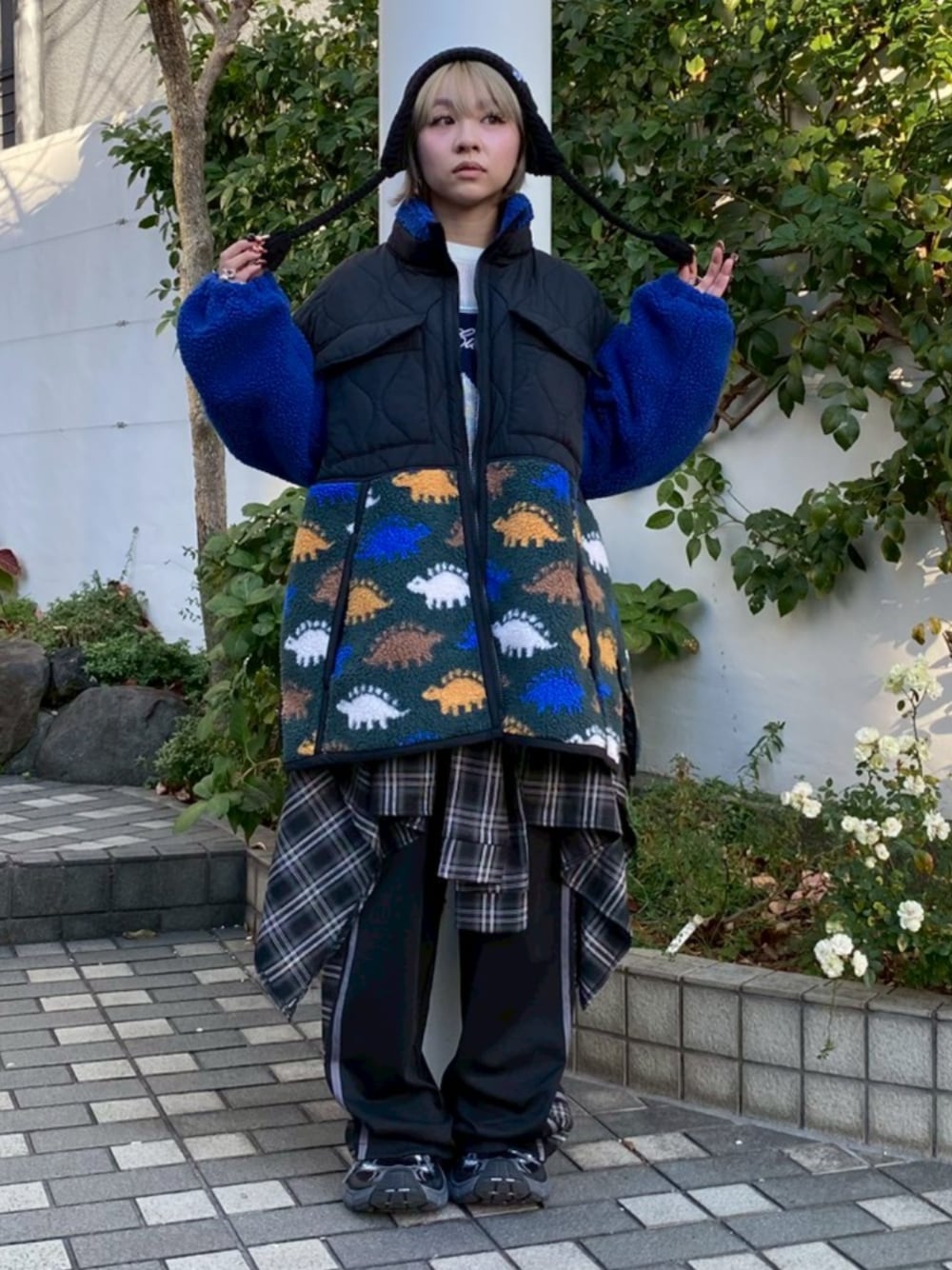 ダイナソーモチーフのボアジャケットにレイヤード風デザインがポイントのトラックパンツを合わせたカジュアルコーデ♪ Candy Stripper原宿本店/久慈/148cm