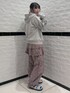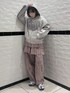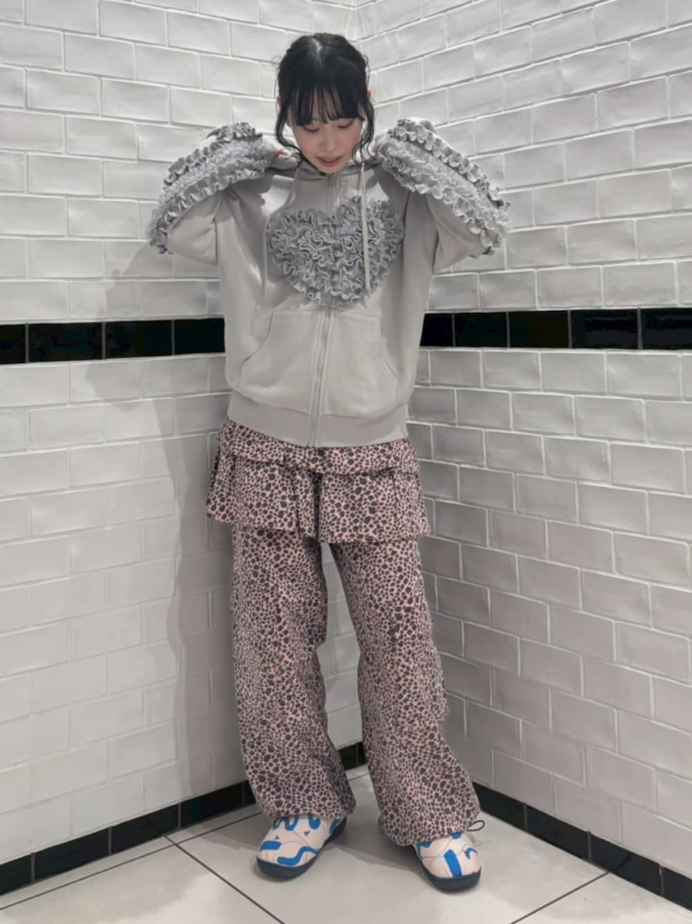 ハート型のフリルがポイントのフーディーにレイヤード風パンツを合わせたカジュアルガーリーコーデ♡ Candy Stripperのスウェットを使ったコーデ