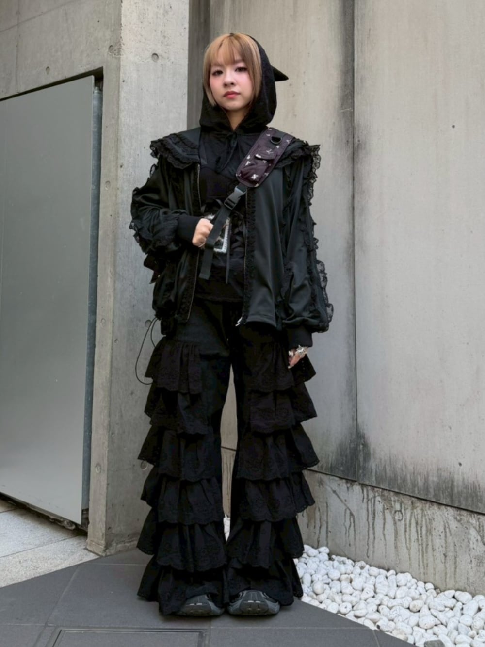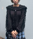 レース素材のフーディトップスにニットビスチェを合わせ、 フリルがポイントのジャージとデニムパンツを合わせた レイヤードスタイル♪ Candy Stripper原宿店/久慈/148cm