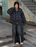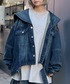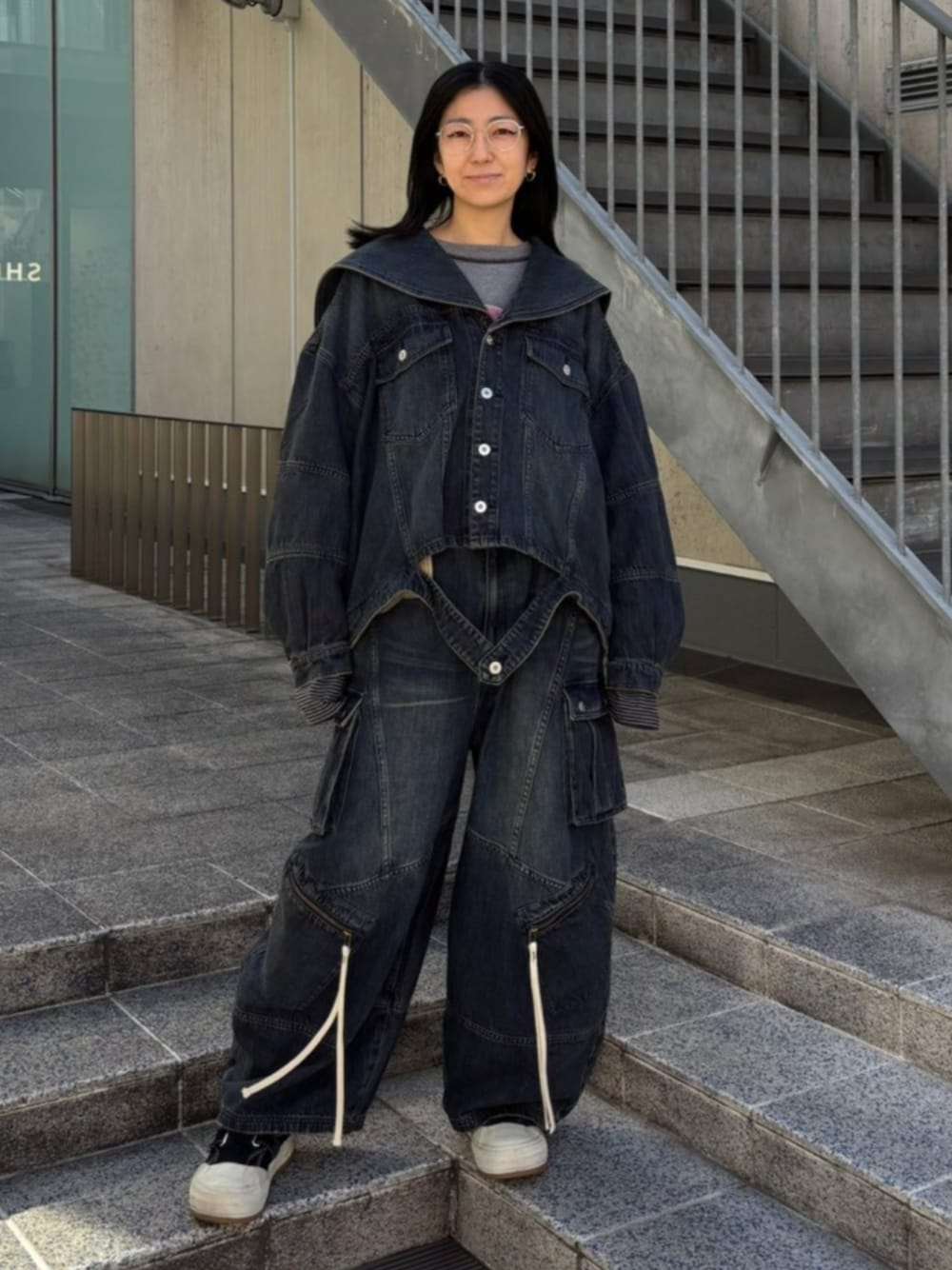 オーバーシルエットのデニムセットアップにボーダートップスを合わせたカジュアルスタイル♪ Candy Stripper本社/小原/162cm