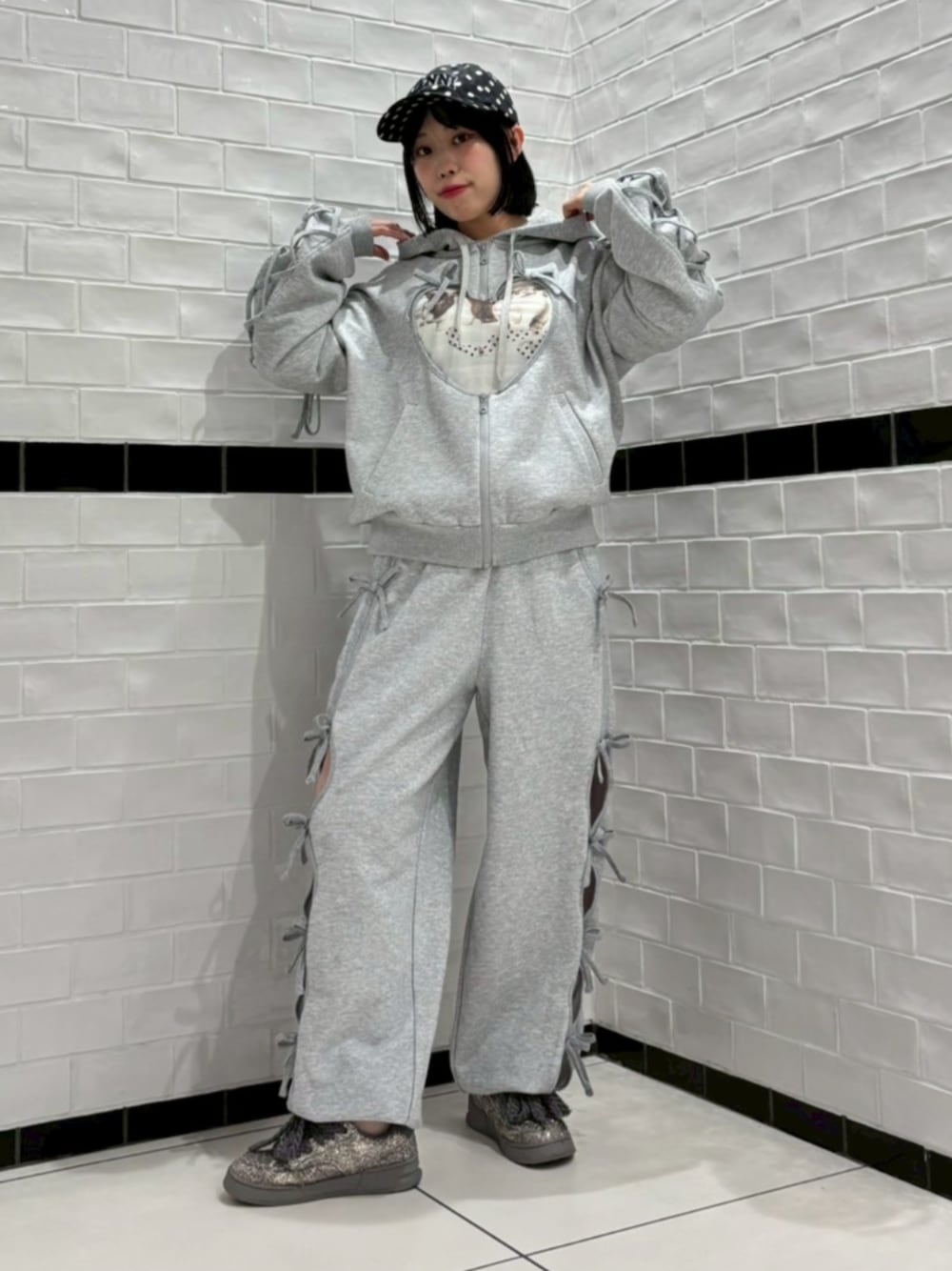 ハート型がくりぬかれたキャッチーなフーディにセットアップのスウェットパンツを合わせたスポーツミックスコーデ♡ Candy Stripper福岡店/河野/160cm