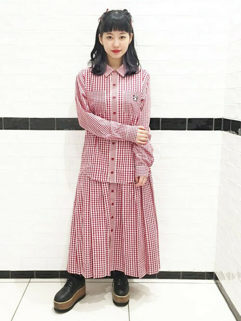 BIGシャツとプリーツスカートをレイヤードしたようなデザインのワンピースにブラックの小物を合わせてROCKテイストに着てみました☆ 胸もとにあしらわれたANARCHY PEPEの刺繍がポイント! 前面のボタンを全部開けてガウン風に着こなすのもオススメです♪