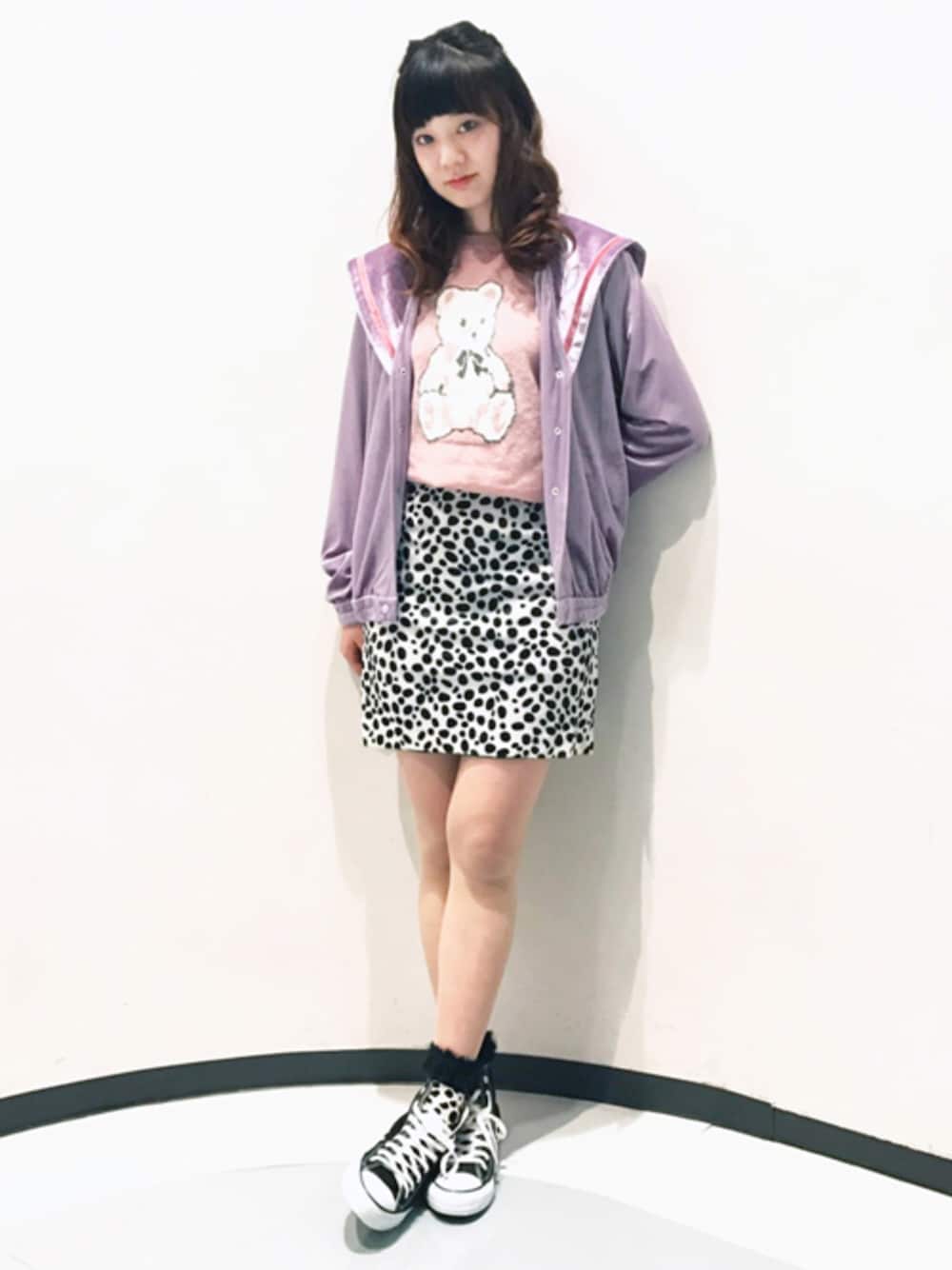 WEBカタログに掲載されて大人気を博したセーラーカラーがキュートなベロアのジャケットを主役にダルメシアン柄スカートを合わせて甘辛MIXに♡ 春におすすめのラベンダーをチョイスしました♪ ニューバージョンでデニム素材も販売中ですので、併せてご覧ください☆