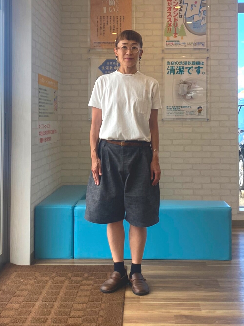 パンツの形を生かしたかったのでTシャツをインして着用。 私のような脚が華奢ではない人もよく見せてくれる魔法のハーフパンツ。