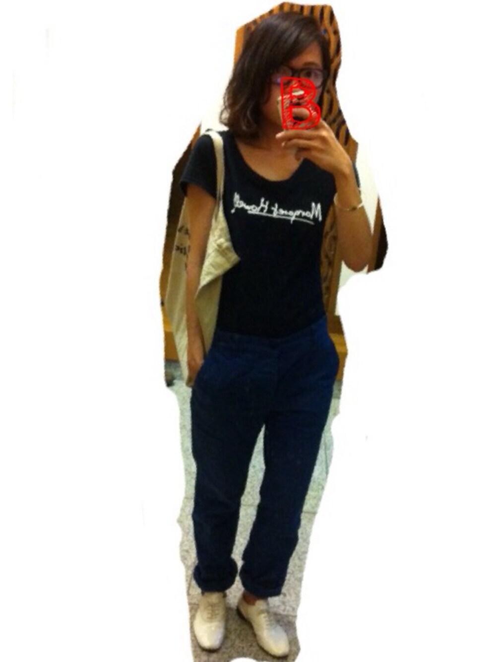 T-shirts/margaret howell/母のお下がり Trousers/MHL Shoes/reppet エコバッグはイギリスはバースの雑貨屋さんで購入しました そこのお兄さんが描いたイラスト 穴空いても縫って縫って使い続けてます 汚れてゴミ袋みたくなっちゃいましたが