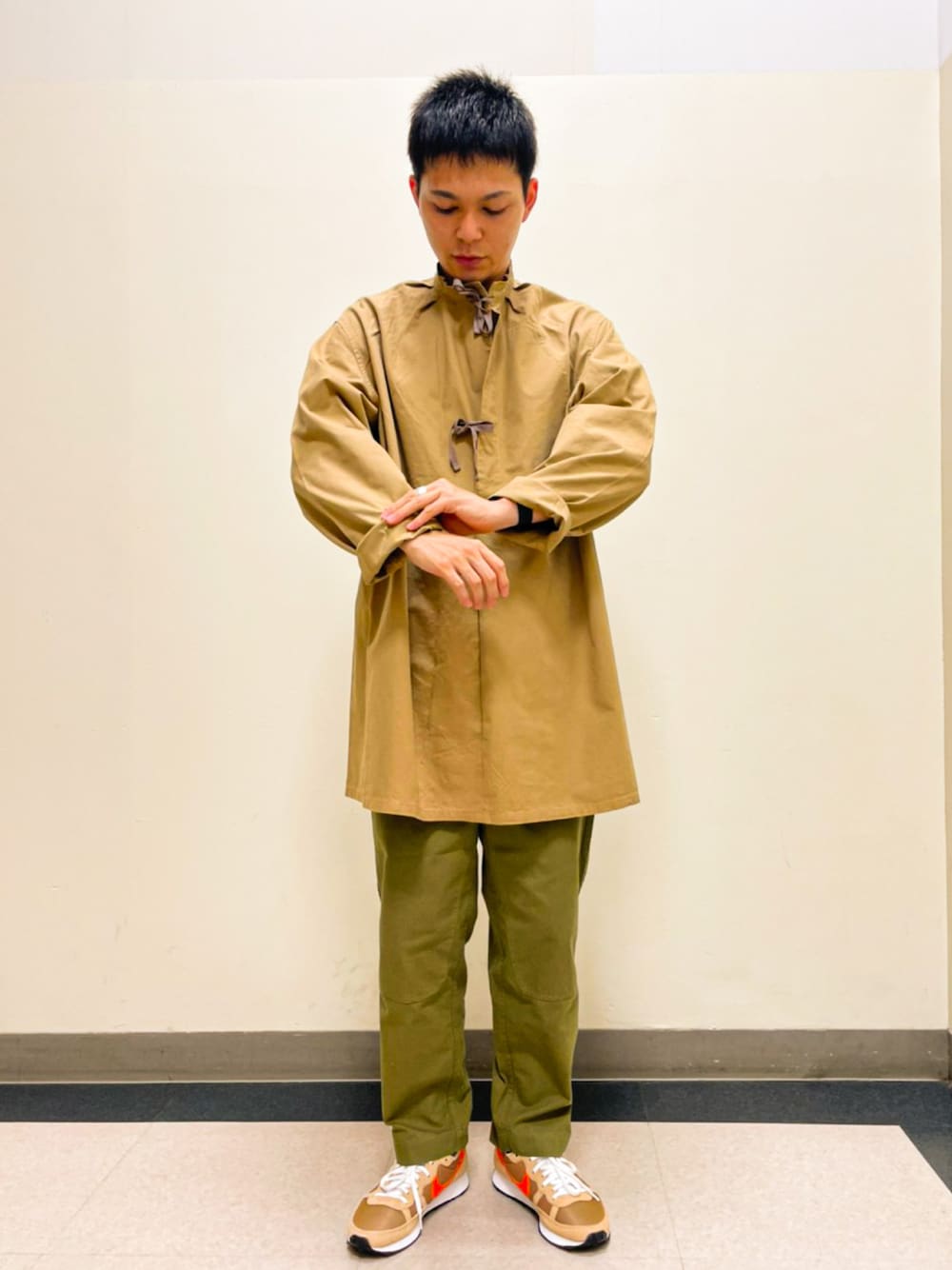 皆様こんにちは。 今回はARMY TWILLを中心にアースカラーミリタリーコーディネートを組んでみました。 トップスのスモックが印象的ですよね。 ハイネック仕様になっていて、紐二つで留めるディテール、更に袖幅、身幅共にゆったりとしており若干Aラインシルエット。ユーロものに多いイメージで、野暮ったくなり過ぎないように袖を捲るのもポイントです。 パンツはシルエットが綺麗なミリタリーパンツ、されどダブルニーであったりポケットがたくさんあったり、地厚なコットン生地なのが◎。 シューズはトップスと合わせてベージュのNIKEスニーカー、オレンジのNIKEマークが効いています。
