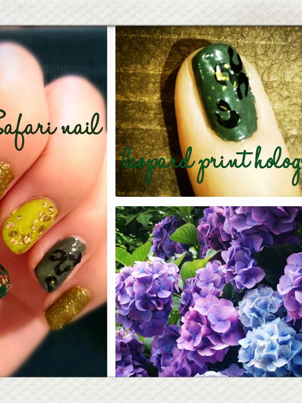 ☞Safari nail☜ アマガエルとか雨で濡れた葉っぱのきらめきとか最近見た光景でインスパイアされた気がする。 セルフで頑張ったよ((:D) 薬指の豹柄ホログラムanother editionで。 こんなのあるんだー(^^)✡ ときめいた♡ サッカー大好きで、 もちろん代表nailしたけど、 すぐ剥がれた…。 不吉(º ロ º )¤ 紫陽花がキレイな季節(❁´ `❁) 鎌倉あじさい寺行ったよ。
