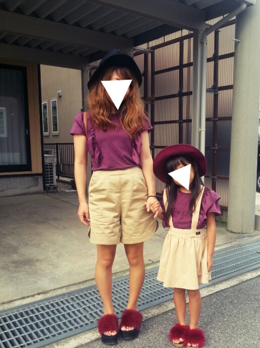 GUのkidsのTシャツをお揃いで♡ ボトムはベージュで、ハットかぶって合わせました♡