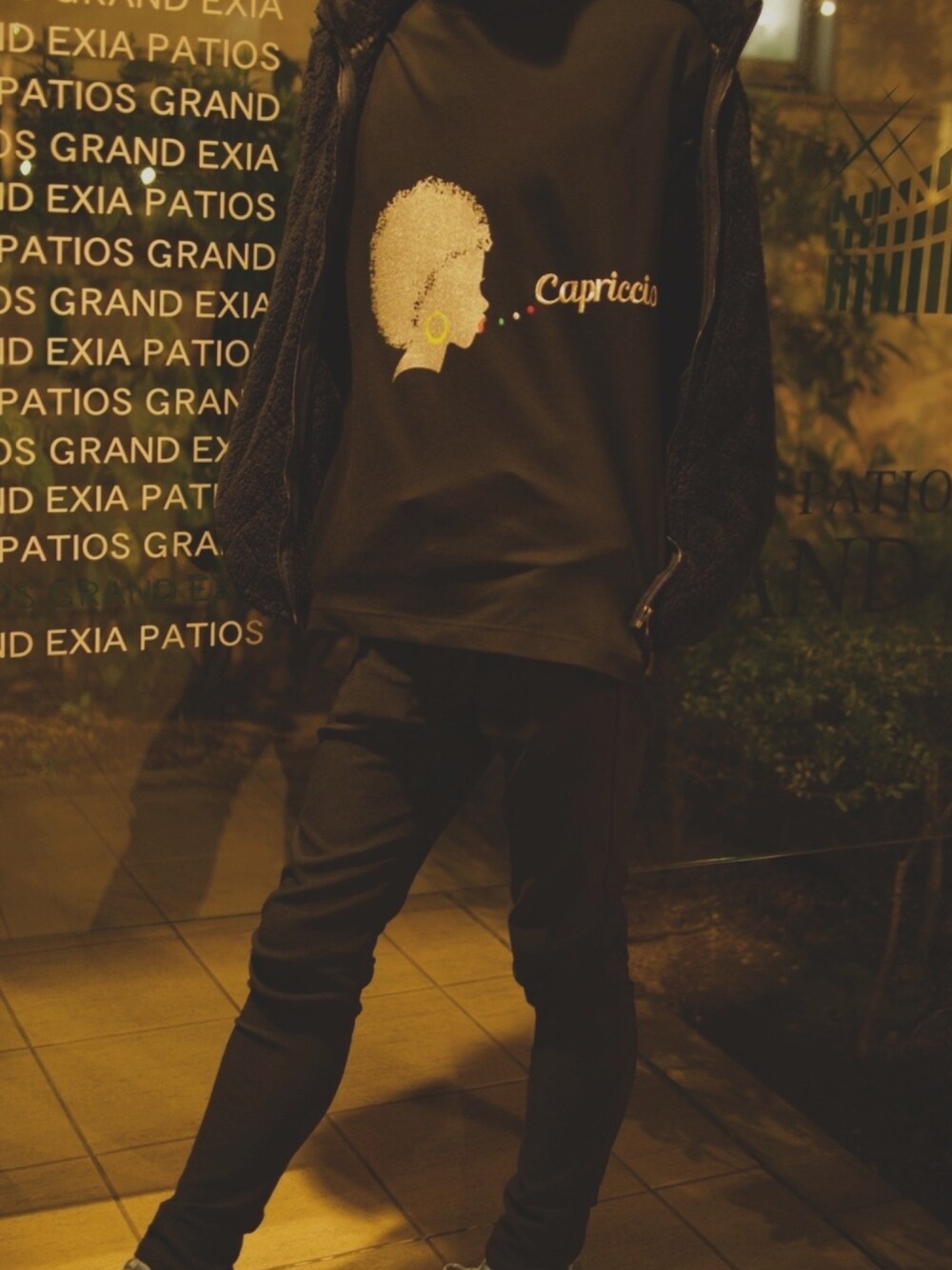 Capriccio のtシャツと黒パンツ組み合わせ抜群! 着心地も良きです! Instagram @capriccio_officialstore