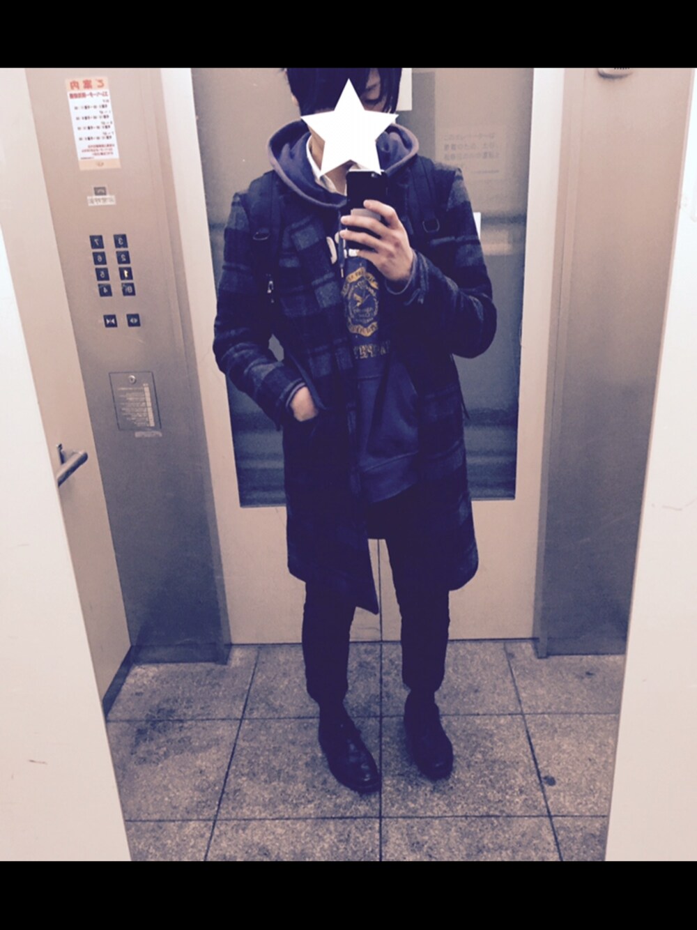 バイト前に撮影📷 チェック柄のチェスターコート。 大好きでいっつも着てます✨ 某カフェでバイトしてます。緑のエプロンを付けてますΨ( 'ω'* )