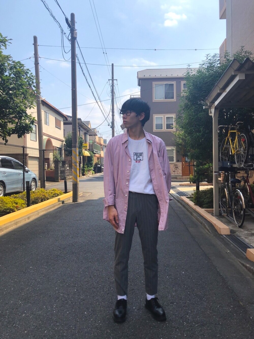 秋が近づいてきたので新しく買ったGUのトラウザーを履いて撮ってみました。 グレーと紫で秋感演出🍁