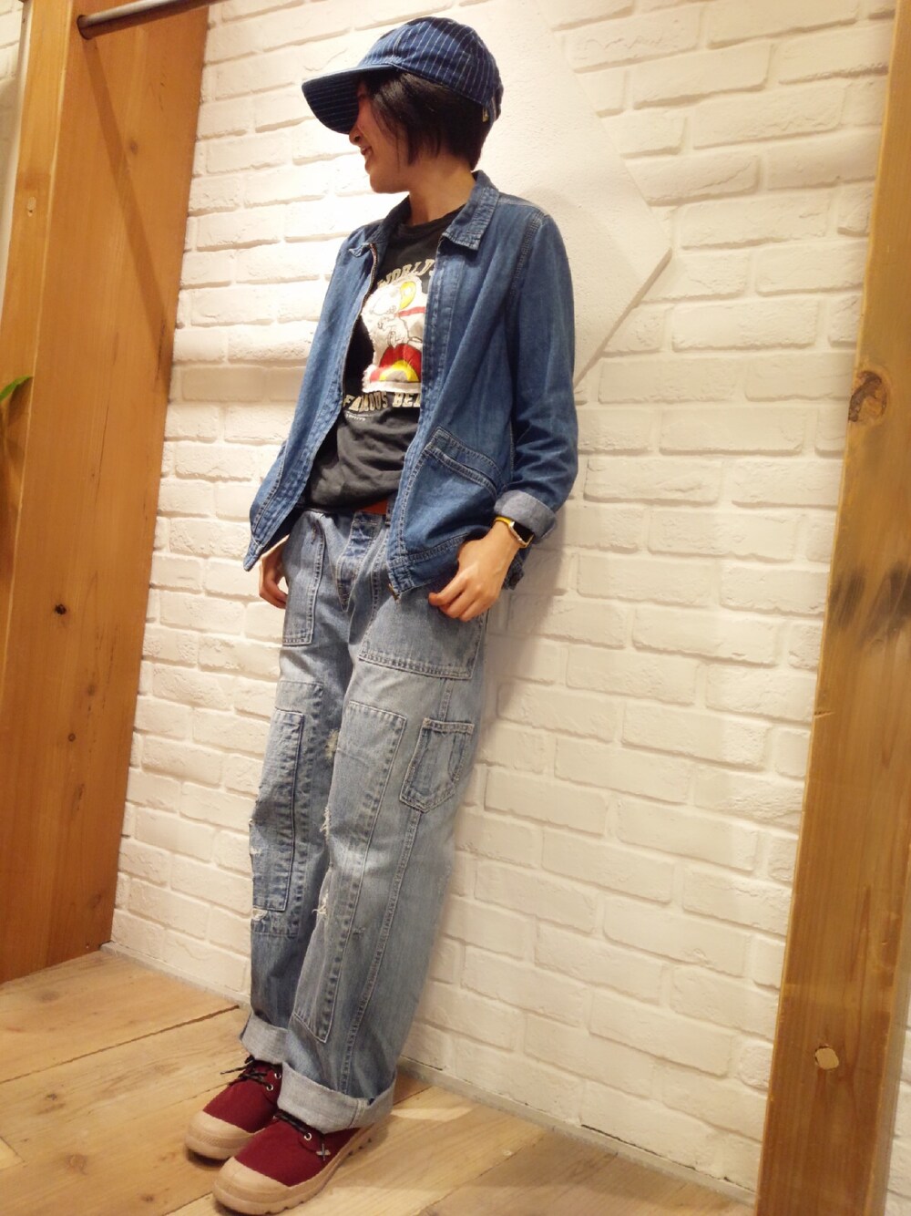 ran ranのデニムパンツ「Denim Damage Bib Overall Pants/デニムダメージビブオーバーオールパンツ」を使ったコーディネート