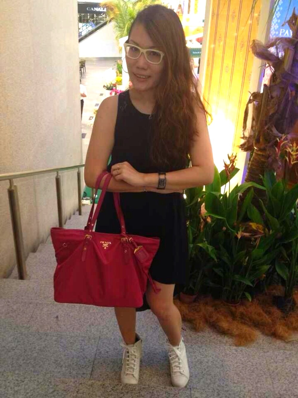 ブラック系のドレス、レッド系のトートバッグを着用したレディースの春コーディネートの1枚目の写真