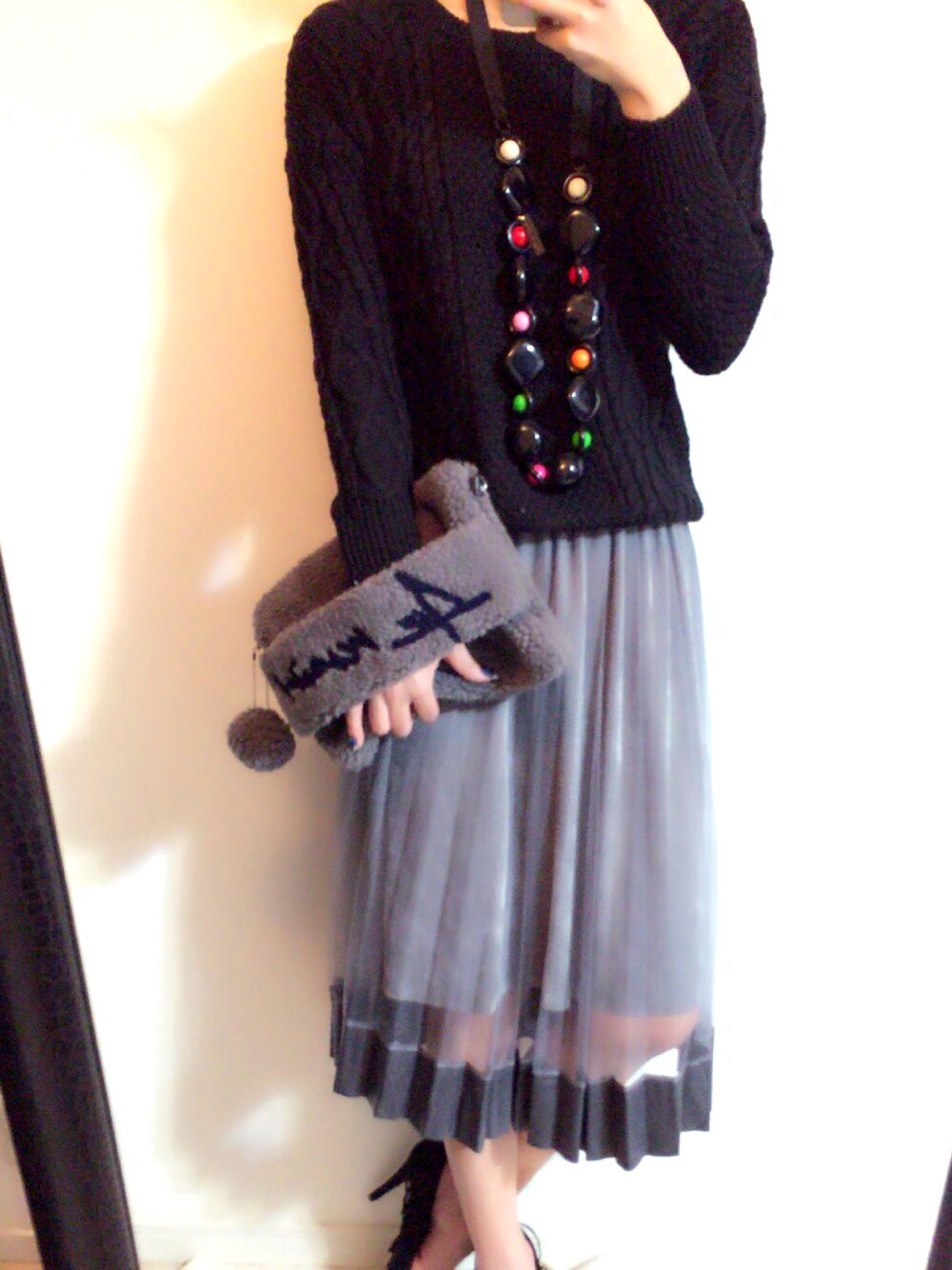 シンプルだけど、スカートのデザインがちょっと変わって可愛い💗 中はベロアで、チュールの裾はレザーで切替✨ ニット👚スカート👗クラッチバッグはメルカリで出品中✨