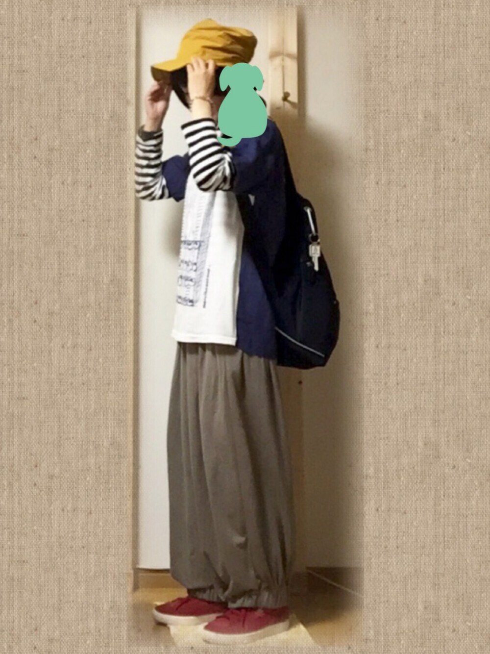 涼しかったので、無印のボーダーTを下に ◡̈* メルシーのパンツは思ったより大きかったけど、ラクでよし◍´ᆺ`◍