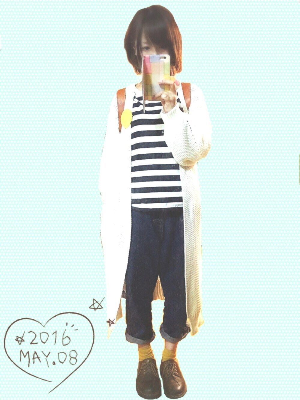 カーデが白いから今日は背景ミントです◯ ライトが暖色だからどこまで髪の毛か わからなかった:;(∩´﹏`∩);: 母の日だからほっこり系コーデです◯ バッヂと靴下色合わせました〜◯