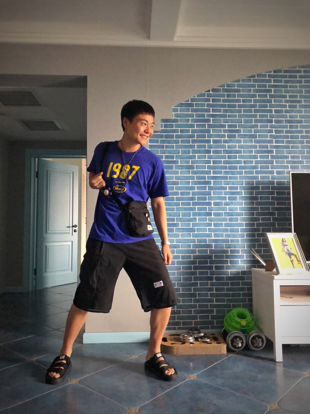 ブラック系のショルダーバッグを着用したメンズの夏コーディネートの1枚目の写真