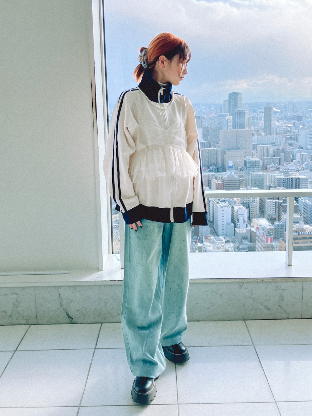 トラックジャケットとパールの相性が最強❕🤍 一目惚れして買ったキラキラデニムも良い感じ💎