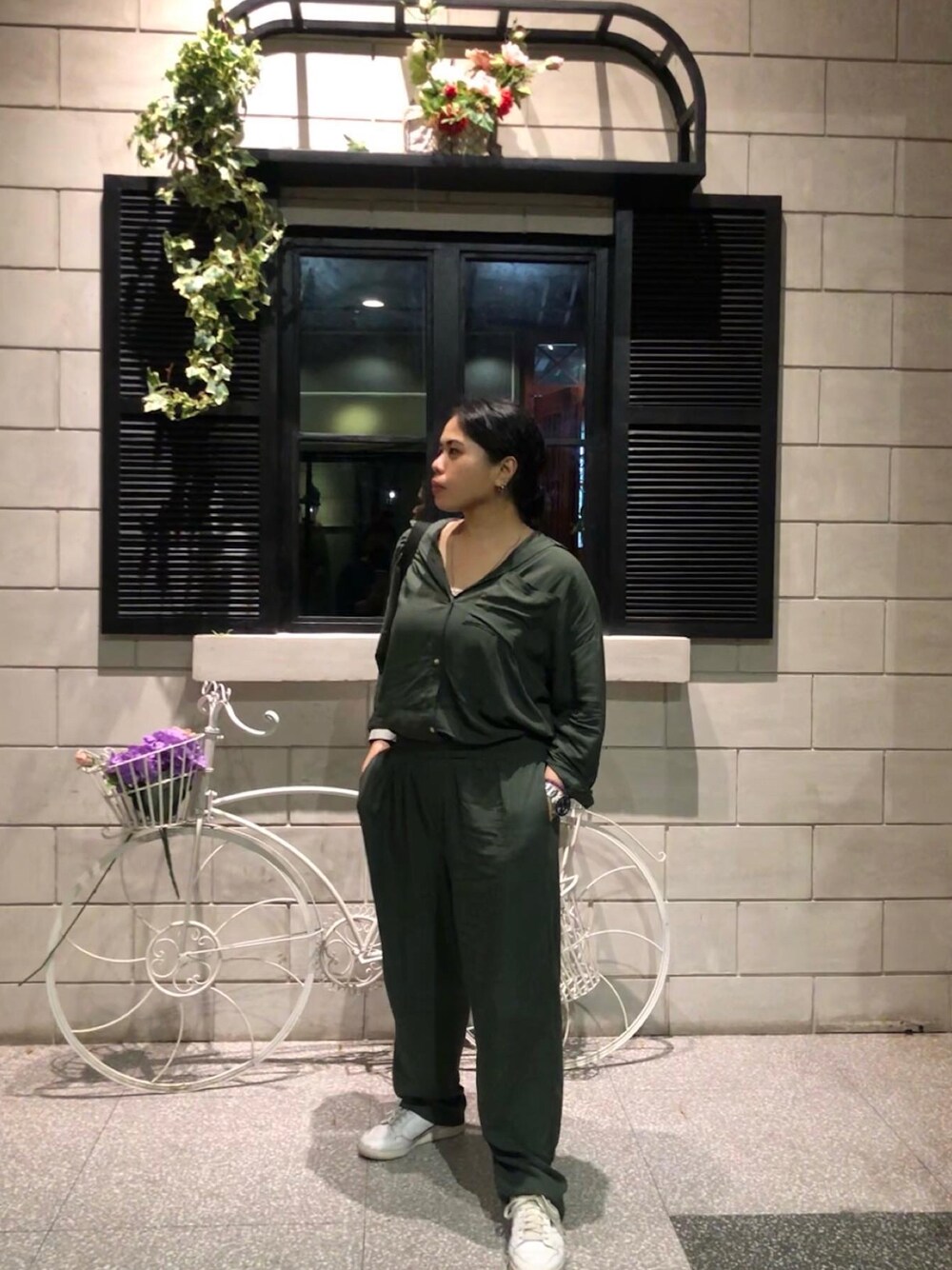 ブラック系のスニーカーを着用したレディースの夏コーディネートの2枚目の写真