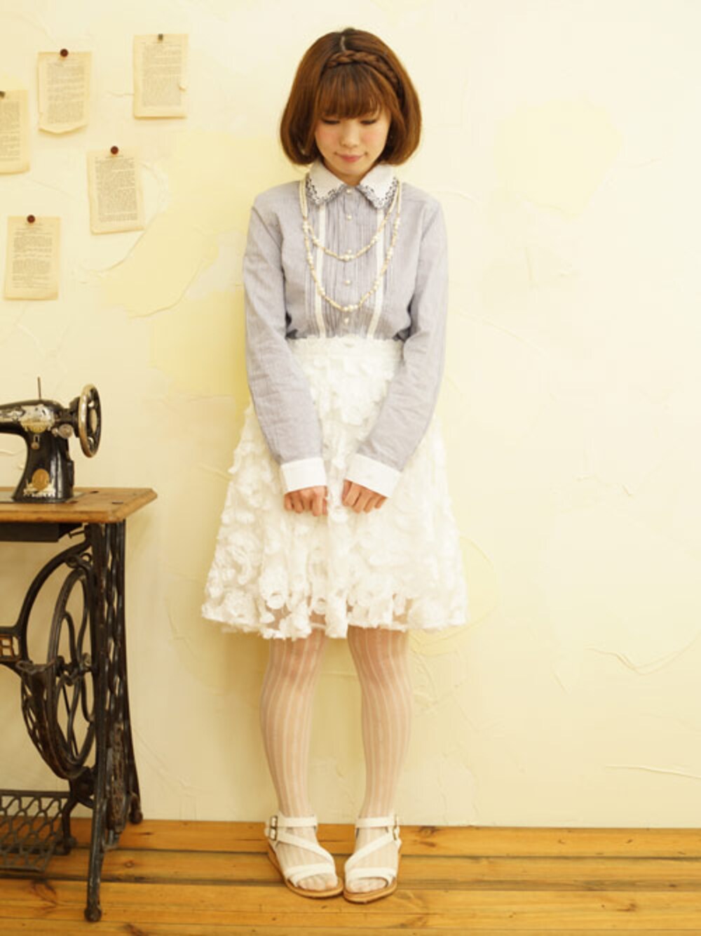 ホワイト系のスカートを着用したレディースの春コーディネートの1枚目の写真