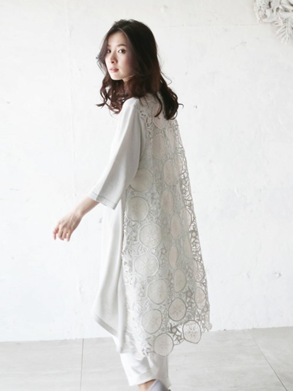 6/6 美しいバックレースチュニック(グレー)。異素材バックコンシャスチュニックワンピース 前から見るとシンプルなチュニックですが、 後ろレース切り替えでバックコンシャスな 後ろ姿にも気を抜かない大人女性に ぴったりなアイテムです。 大胆に使われたカットレースが 後ろ姿を華やかな印象に。 しっかり長めの丈感は 気になる体形をカバーし、 ボトムを選ばず コーディネートの幅を広げます。