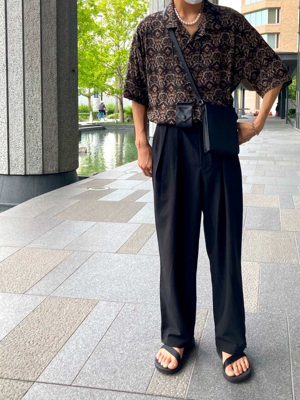 ・ ・ こんにちは🌱 ・ 今回は【柄シャツコーデ】です🟤 ・ ・ このシャツめちゃめちゃ可愛いのでオススメです。👍 開襟シャツにパールネックレスはとても合いますね。🧚🏻♀️ ・ もっとワイドのパンツ欲しいです。