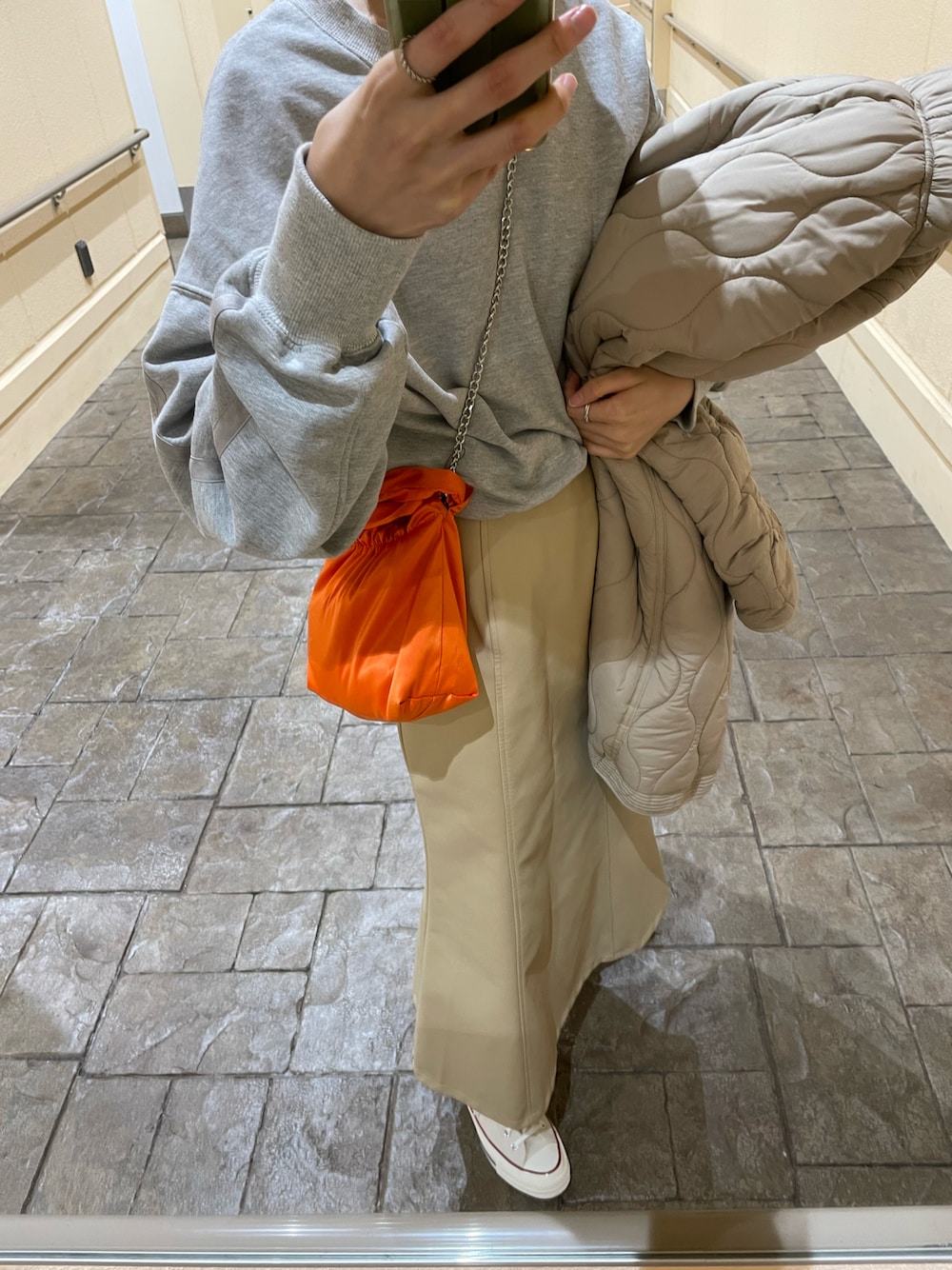 ポイントはオレンジ🍊バッグと スカートのスリットからチラッと見える am/pm のコンビニソックス🧦🍊🍇 このスウェット本当着心地最高〜