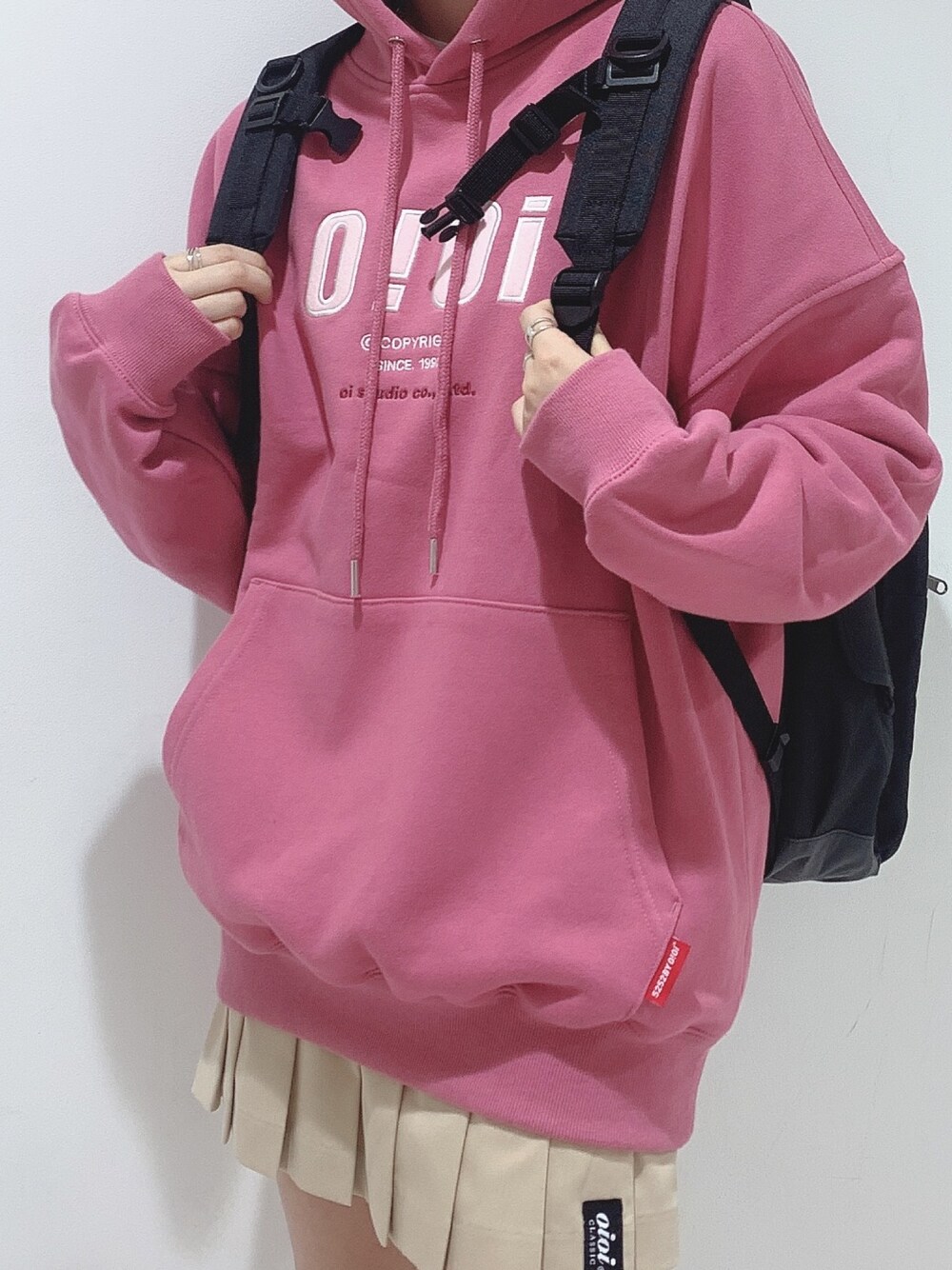 ピンク系のパーカー、ベージュ系のスカートを着用したレディースの秋コーディネートの1枚目の写真