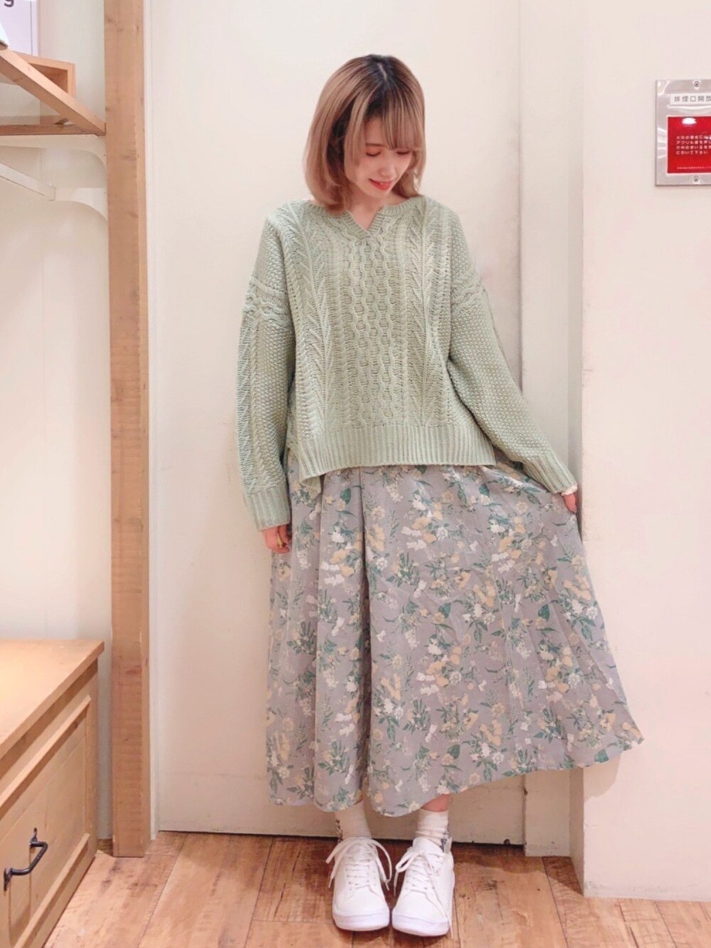 ✎キーネックケーブル編みニット 春に向けて爽やかなミントのニットです* 流行りのキーネックに 肩落ちの可愛らしいシルエット( ˊᵕˋ ) スカートでもパンツでも 1枚でお洒落に着れます◎ 色違いの ブラウンとホワイトもとっても使いやすいです*. ✎ 柄アソートギャザーフレアスカート 大人綺麗めな花柄スカート。〇 落ち着いた、くすんだ色味が 春色に相性抜群です( ¨̮ ) 色違いには無地のホワイト、ネイビー 軽くしっかりした生地なので 楽にさらっと着れます♩ 今回は春意識で ホワイトのスニーカーを合わせてみました.♡ ------------------ 福岡 / SM2 店舗スタッフ ご覧頂きありがとうございます フォロー&コメントも お気軽にお待ちしております☺︎ ------------------