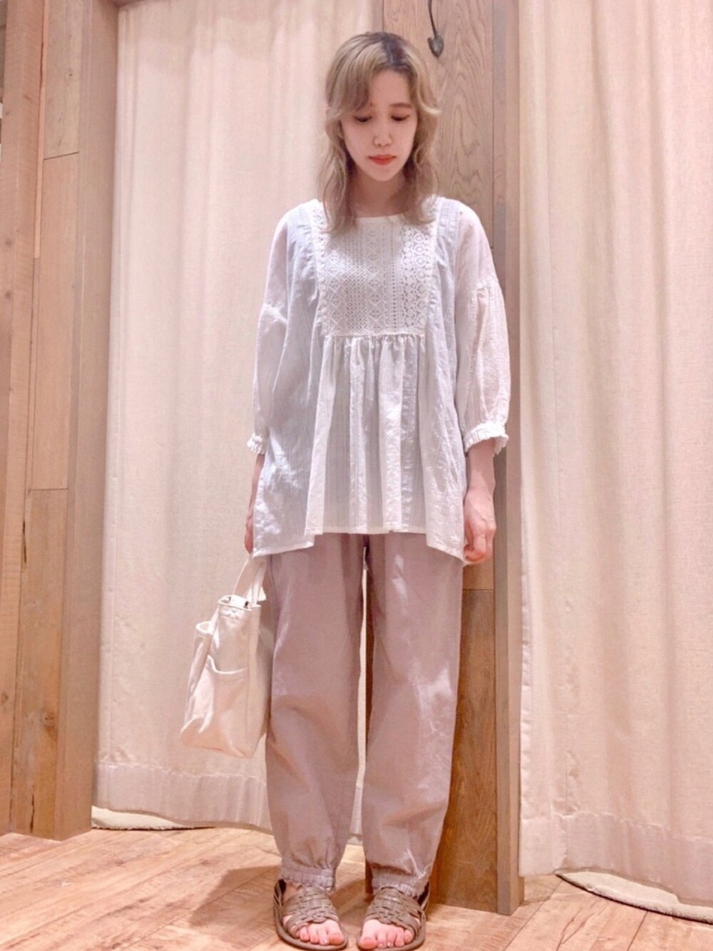 anoのその他パンツ「綿麻裾ギャザーレースパンツ」を使ったコーディネート