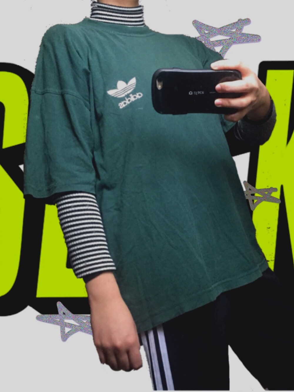 ストリート系に挑戦がち🌈 緑のadidasTシャツは古着です🌵 中にレースを着てスカート履いて可愛く着ても良さそう😌💫