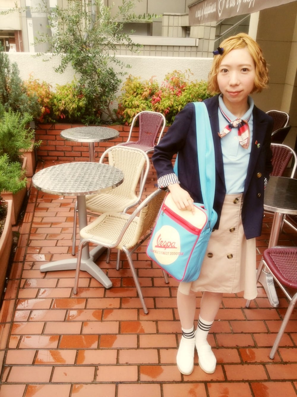 ジャケット…child woman ポロシャツ、タイ…Fred Perry スカート…on the couch シューズ…Page boy バック…Vespa(スタンダードブックカフェ) ヘアアクセサリー…ジェニファーオレット