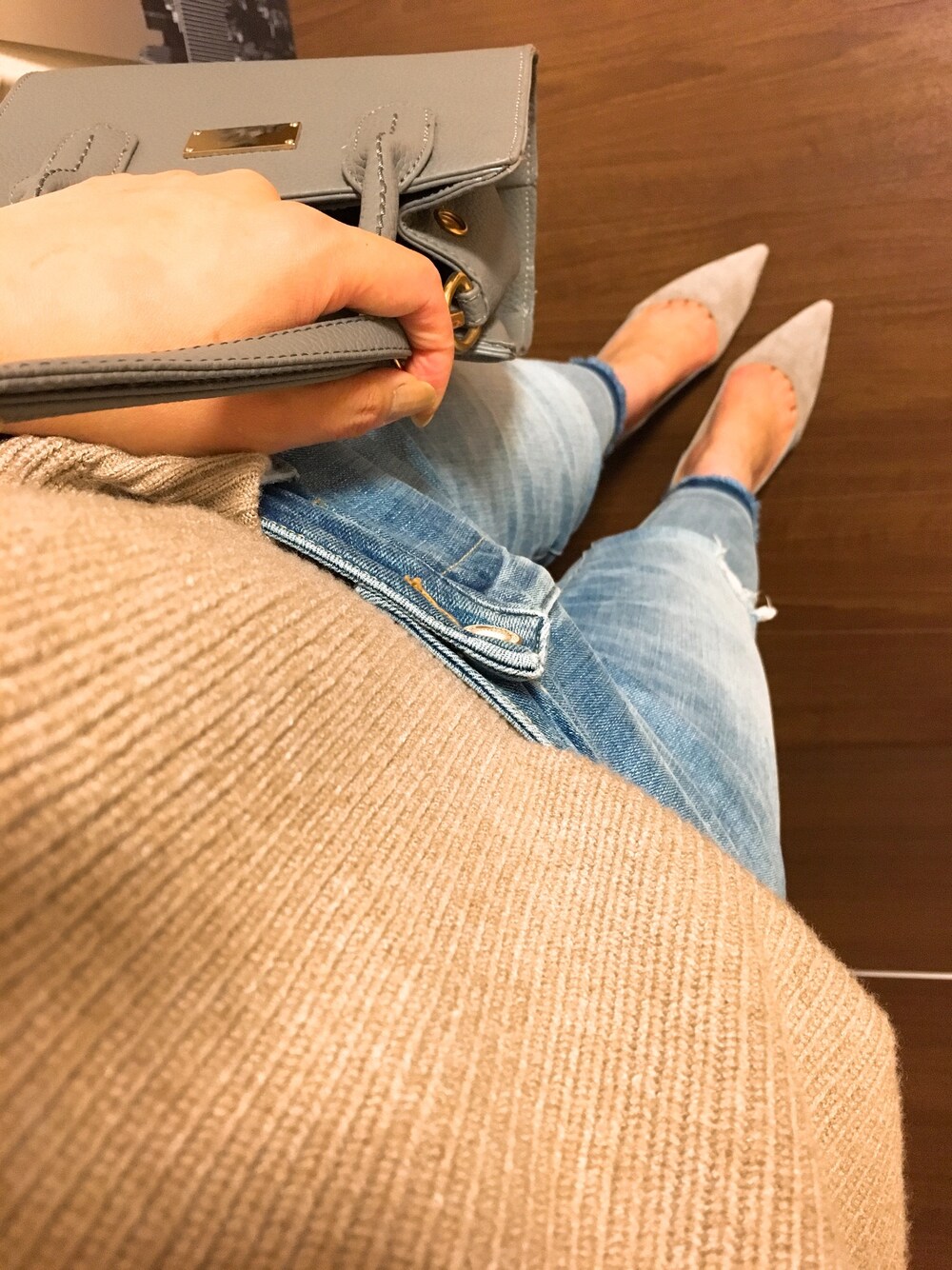 ライトブルーデニム×ベージュニット このニットのとろ〜ん具合がすき😚