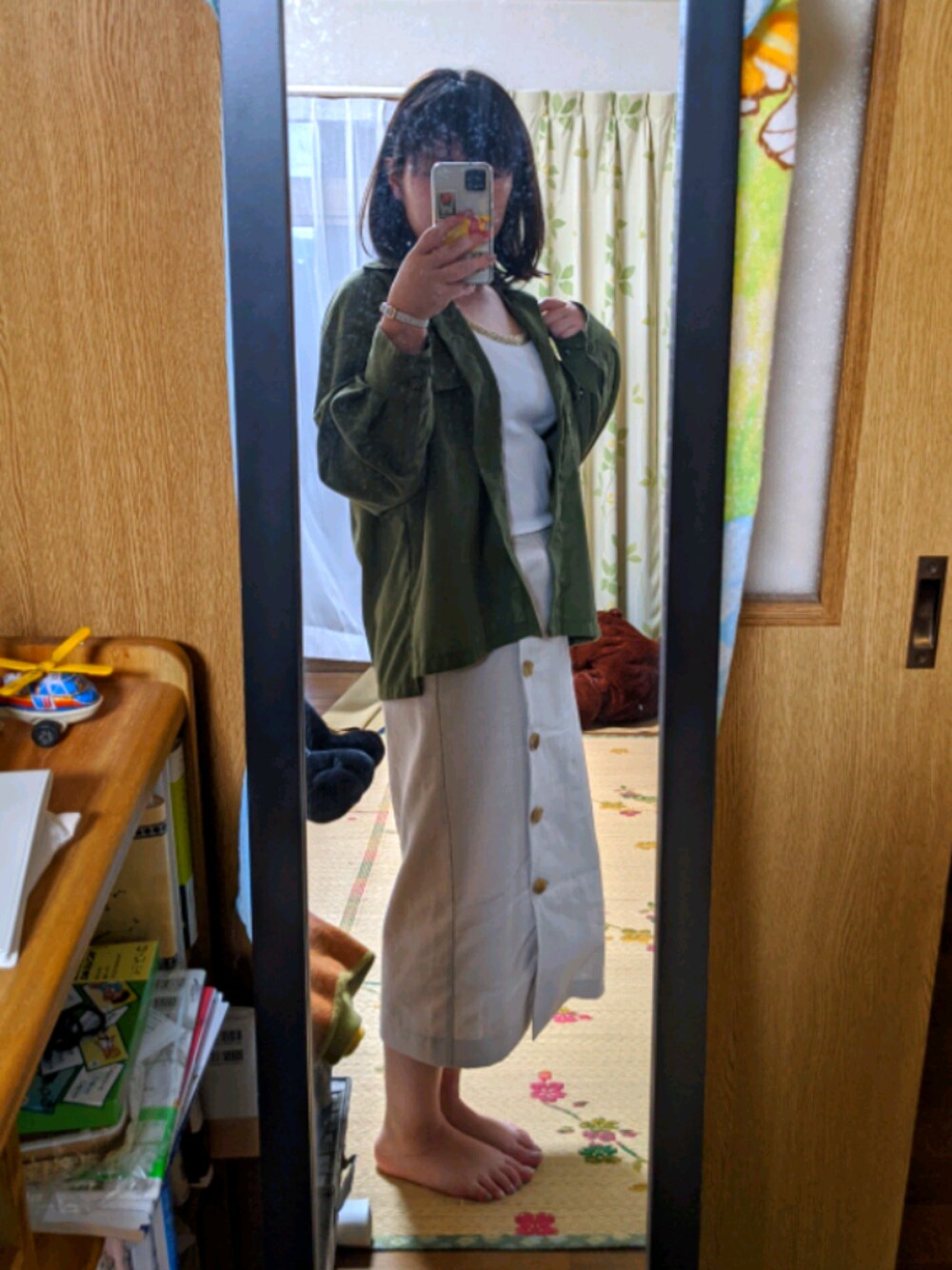 実家にて。4ヶ月ぶりの帰省! ほんとはデニムを合わせようかと 思ったけど、キナリのスカートも 意外に相性good◎ 雨のあとは涼しい✨