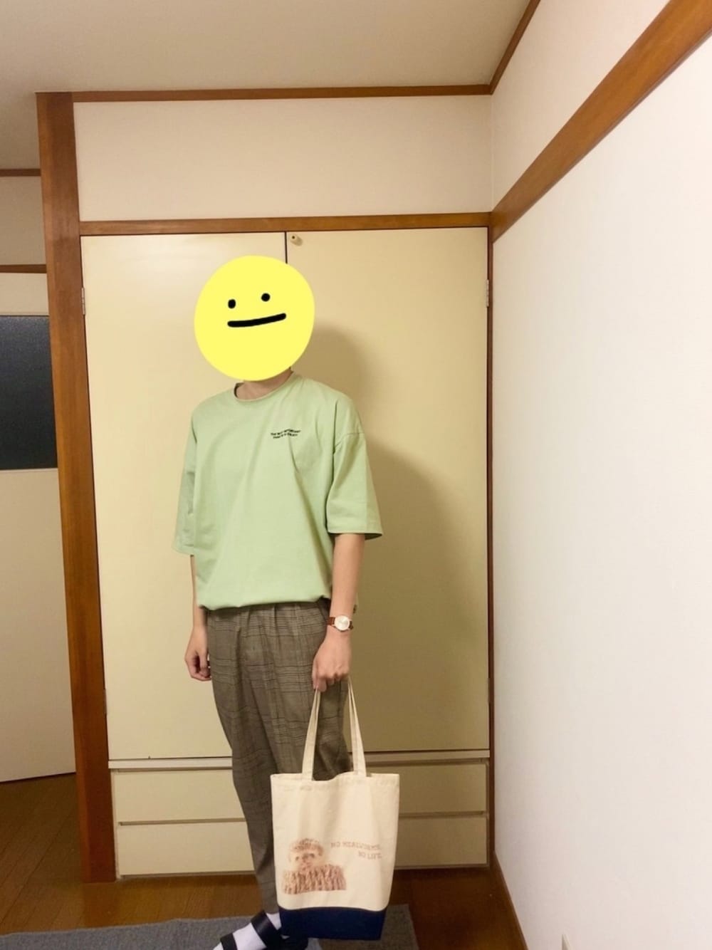 kutirのライトグリーンのロゴTがいい感じだったので買ってみました。パンツは黒とか白でもあうと思います。ただ、黒と合わせる場合は靴下とか靴とかで白を取り入れないと雰囲気重く感じると思います。あと、丈が長いので、タックインした方がスタイル良く見えていいと思います。