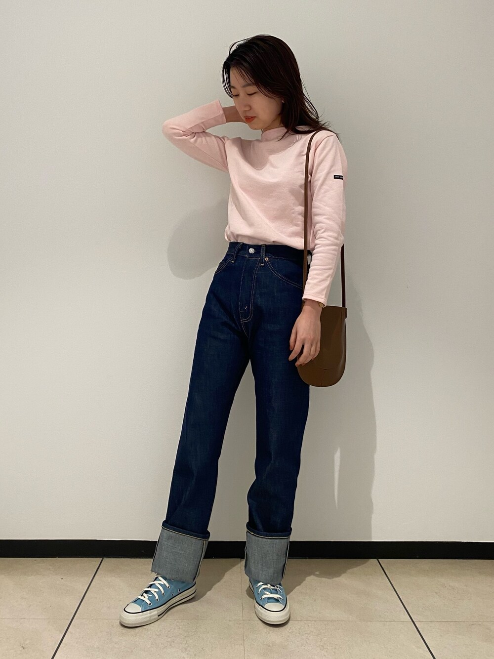 Levi's701 デニムとセントジェームス のカットソー合わせたシンプルでカジュアルなコーデ。 春を意識したピンクのカラーを デニムで合わせることで甘さを控えめにしています。