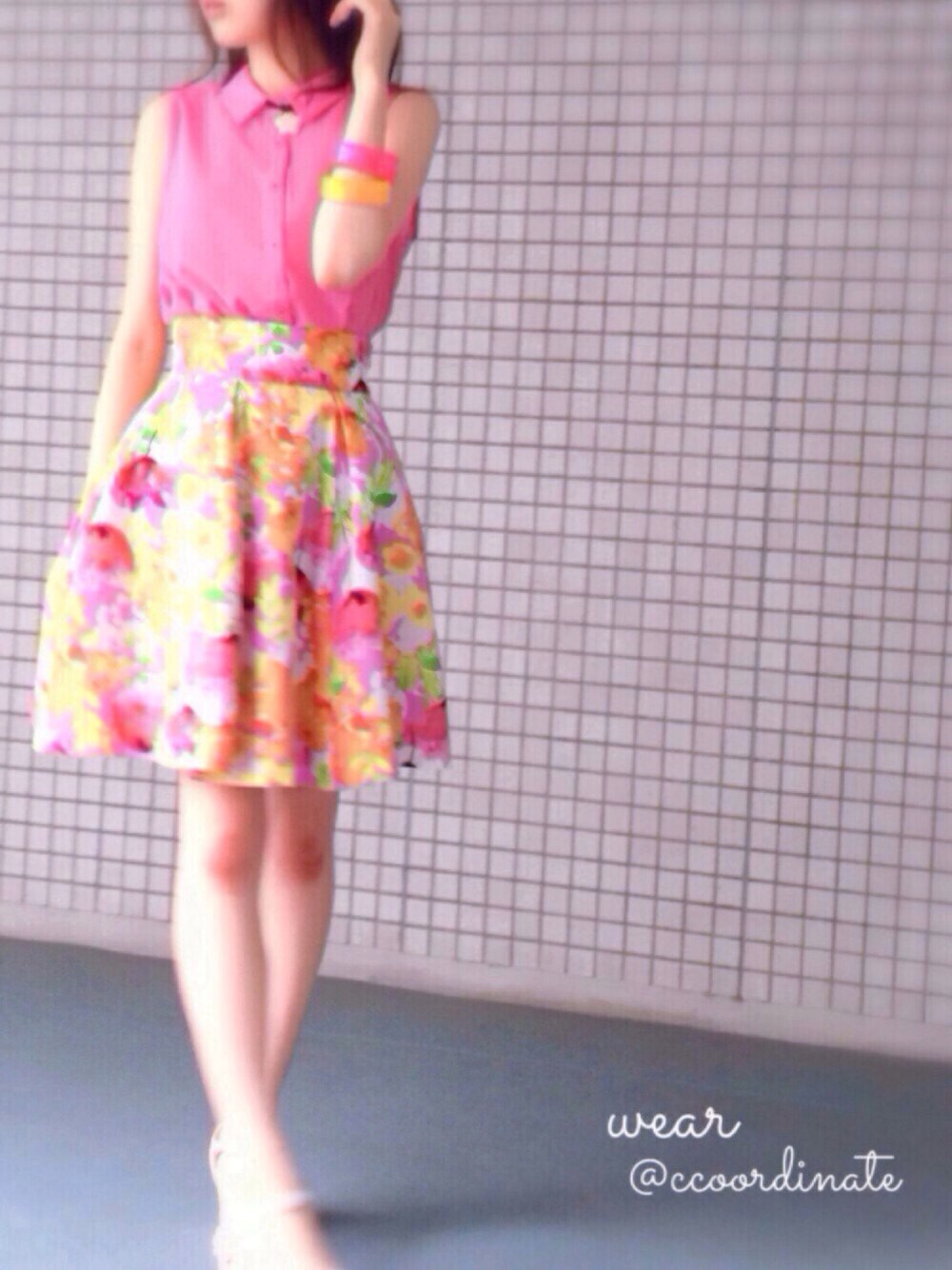 夏らしく トロピカルカラーのコーディネート✧︎*。 スカートの花柄のピンクと トップスのピンクを合わせてみました このスカートはキレイな色の花柄だから コーデのポイントになってくれます お気に入り◡̈⃝︎⋆︎* クリアカラーのブレスレットの色も スカートに合わせて✧︎*。 スカートが花柄なので サンダルは花かざりがついているものに 花柄スカートが主役のコーデ◡̈⃝︎⋆︎* 前回のコーデに いいね ありがとうございます⑅︎◡̈︎*