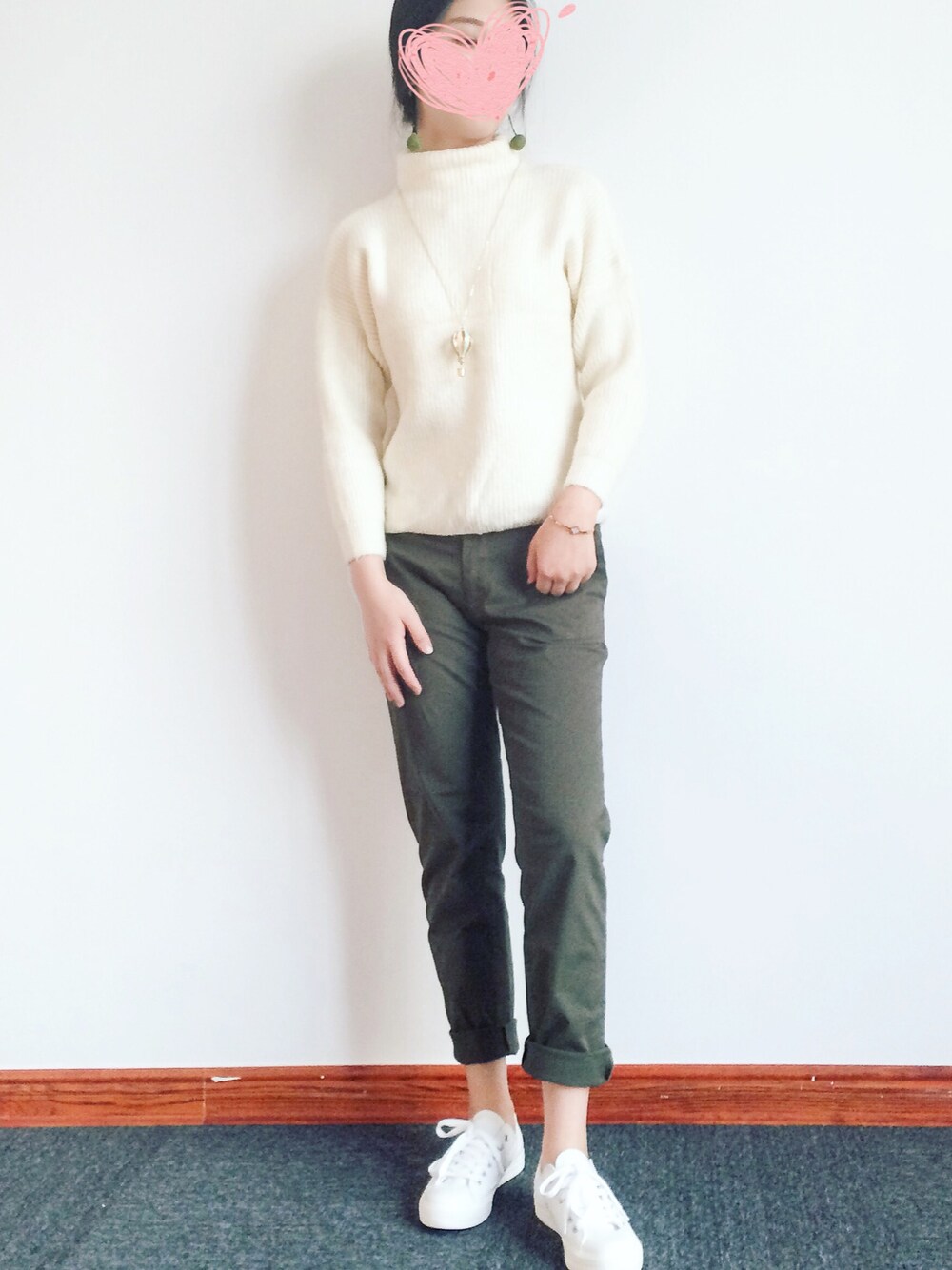 毛茸茸的绿色耳环和绿色裤子非常的搭吖!!虽然下雨了,穿着清爽,心情也是棒棒哒!