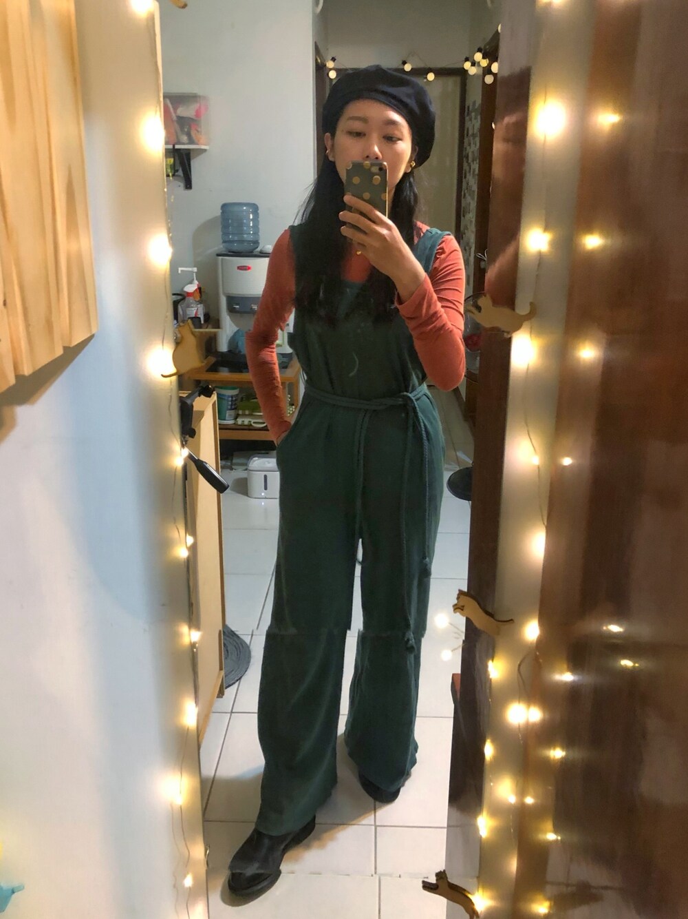 グリーン系のオールインワン・サロペット、オレンジ系のTシャツ/カットソーを着用したレディースの冬コーディネートの1枚目の写真