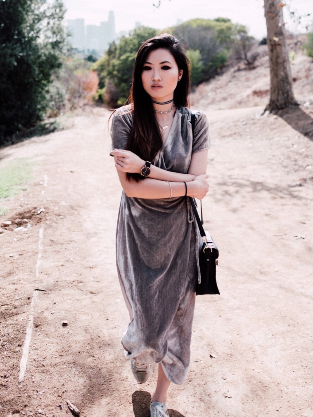 Stomping nature's ground with my velvet wrap dress and a pair of casual kicks! Visit www.cecelam.com or IG: cece.lam for more.