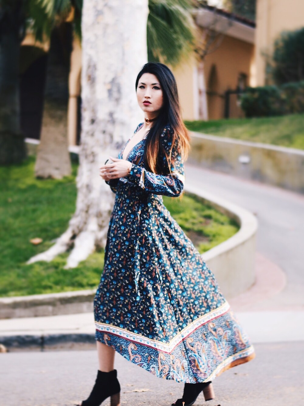 グリーン系のドレス、ブラウン系のネックレスを着用したレディースの冬コーディネートの1枚目の写真