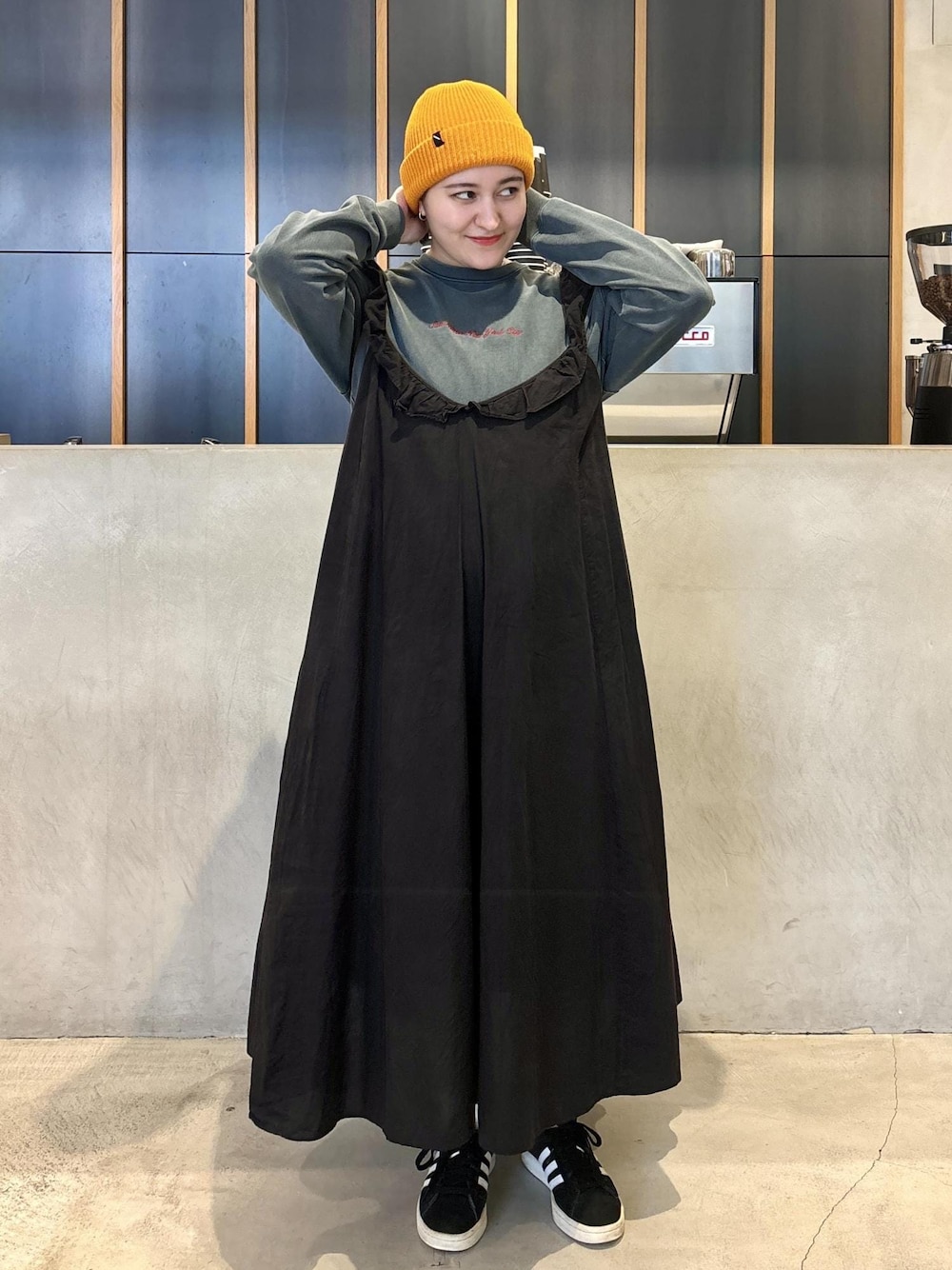 久々の投稿となってしまいました! 本日は着回しのワンピースを活かしながらトップスと小物で変化をつける日々のコーディネートの1つをご紹介します:) ロンTはロゴが刺繍になっており私が選んだTeeの色も緑のようなグレーで絶妙な色合いに赤の刺繍で珍しかわいいアイテム○ 私には少しクリスマスなカラーリングに見えて今の時期に着たくなってしまいます♩(クリスマスなデザインな訳じゃ無いのでもちろん通年使えます!) 毎年出ているニット帽子、今回私が被っているのは新色!差し色で使いやすく何より頭が温かいと全身も温まるような気がします:)! 私はもう一つのグレーのニット帽子も持っていますが本当にこの形が好きで生地の余りも少なく後頭部まですっぽりと覆われる安心感とコットンが40%も入ってるもちもちニット生地がやみつきです♡ おでこにあたって肌が荒れやすい人もこのニット帽子なら少しはお肌にやさしめかもしれません! 是非店頭でもロンTの生地のしっかりさとこのニット帽子のモチモチ感をお試しください!:)