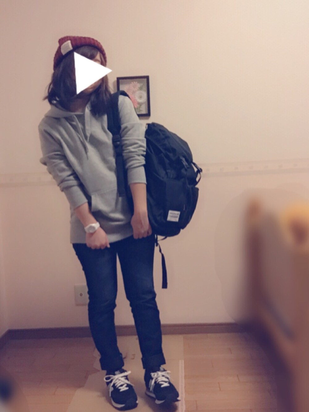 パーカーはguのメンズのMです スニーカーとバックパック合わせて とことんカジュアルに🙌 差し色にボルドーのニット帽と 画像では見づらいですが デニムの裾折り返して ボルドーの靴下がみえるように してます◡̈♥︎