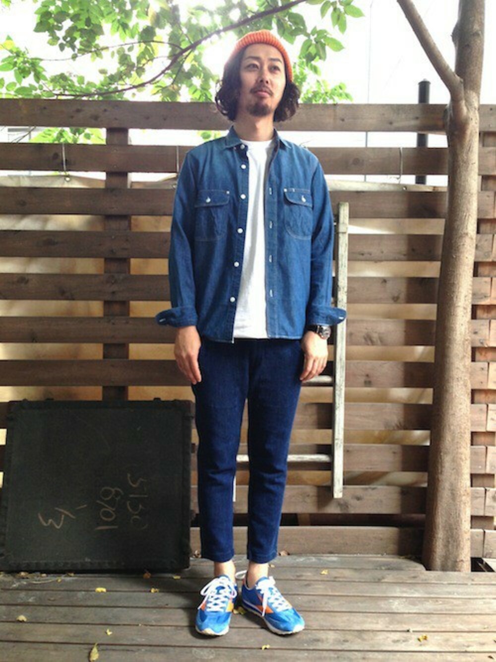 上下共にインディゴですが、素材感でメリハリを。 やはりブルー系とオレンジの相性は抜群ですね。