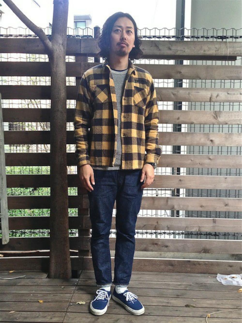 ブロックチェックネルシャツ×デニム×ヴァンズと王道スタイルですが、サイジング、カラーリングで現代風に。