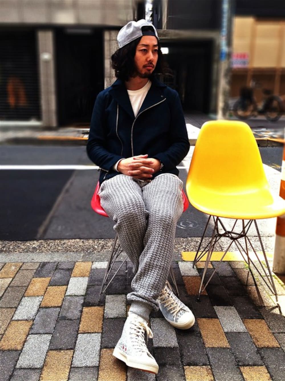 ライダースジャケットメインですがイージーパンツとスニーカーでぬけ感をプラス。 メルトン素材なのでハードになり過ぎず、着心地も◎です。