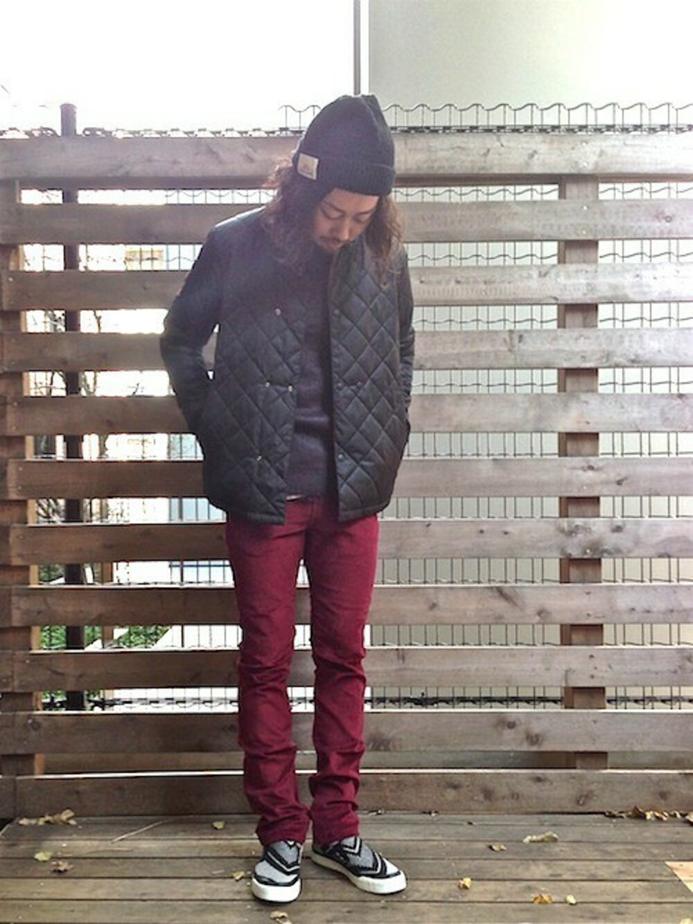 ワインレッドのコーディロイパンツをメインに。 その他のアイテムはモノトーンで統一しつつ素材感でメリハリを出しました。 是非、チェックして見て下さい。