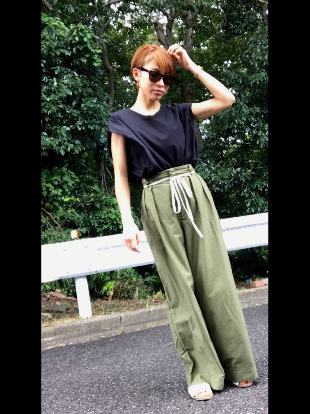 こんにちは〜🍃 丈がぴったりのナノユニのワイドパンツ💚 大変ありがたい嬉しい‼︎ アズールのトップスは白黒2色買い〜 こういう形好きですVネックだし🖤 という土曜の秋色楽チンコーデでした◡̈⃝︎⋆︎*