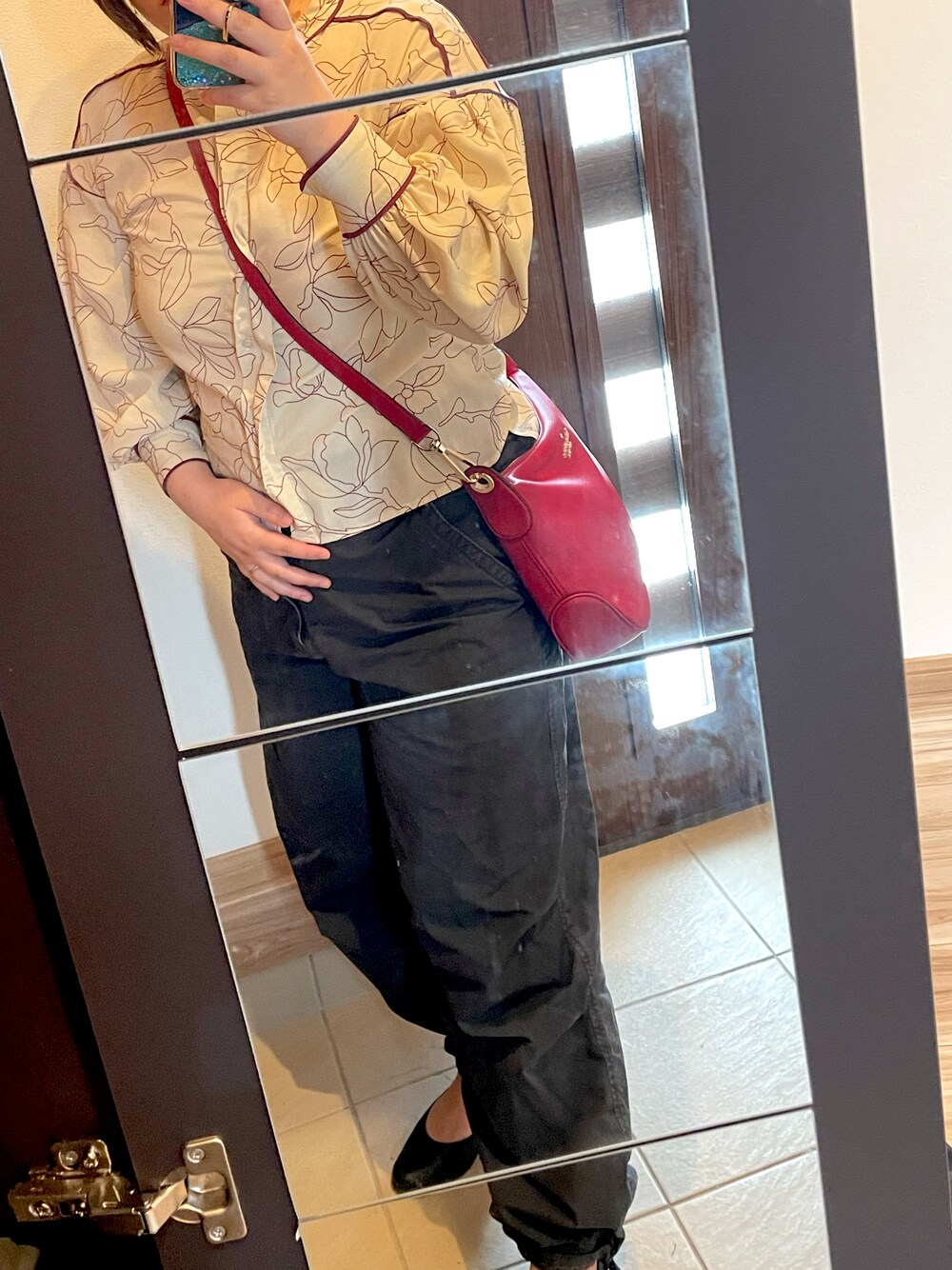 チャイニーズ風赤コーデ🟥 ピアスも赤でかわいいけど写真に映らない😭 美容院に行く時のコーデです 美容院に行くとキレイになれるからファッションにも気合い入りがち👍✨